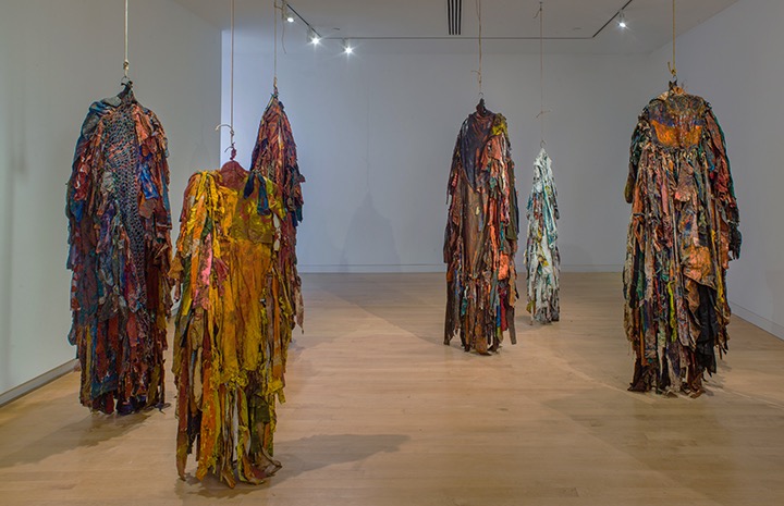 Harmony Hammond: Material Witness, Five Decades of Art, installation view. Pictured, from left foreground, clockwise: Presence III, VIII, VI, V, 1972; Presence II, 1971, and Presence IV, 1972. Image courtesy the artist and Alexander Gray Associates. © 2018 Harmony Hammond / Licensed by VAGA at Artists Rights Society. Photo: Jason Mandella.