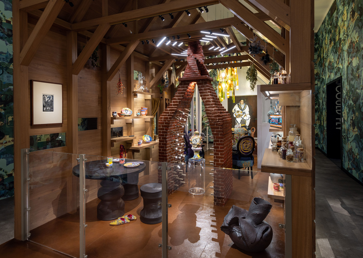 Before Yesterday We Could Fly: An Afrofuturist Period Room is a house-within-a-room located just off the Metropolitan Museum of Art’s Medieval hall. There are more than forty other period rooms on display at the Met, all of them immersive spaces that one can step into or stand on the threshold of. In contrast, viewers surround Before Yesterday, experiencing it by circling a narrow perimeter corridor, peering into the freestanding house through cutouts in its façade. Design objects, home furnishings, books, herbs, and artworks fill its deconstructed interior.