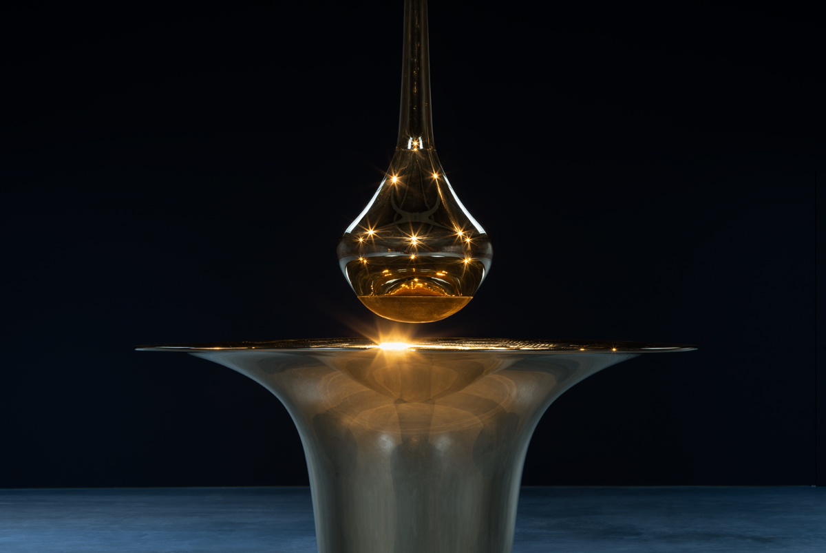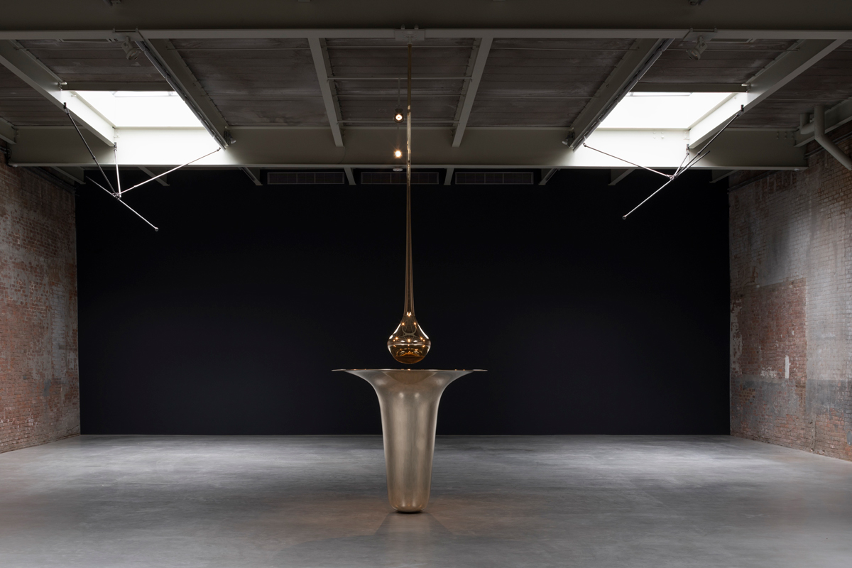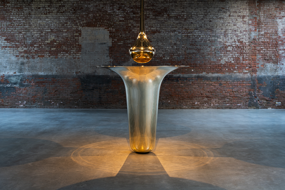 A five-foot-tall brass vessel occupies the center of the gallery. It resembles an oversized Eucharist chalice or an Olympian tuba horn. An amber-colored structure suspends from the ceiling above it like a viscous pour of honey, the drop-shape frozen just a few inches above the tuba/chalice’s flared mouth. The objects’ polished surfaces distill and redistribute the room’s reflected light. Four ceiling microphones point toward the sculpture, feeding the ambient sound back out into the speaker built inside the honey-drop. Plexus treats light waves and sound waves in the same way. The environment could be described as deeply monotheistic, with all attention focused on a single, radiant apparatus at its center, whose self-referentiality (feedback is machinery saying “I Am that I Am”) creates a unified sonic field further structuring the space.