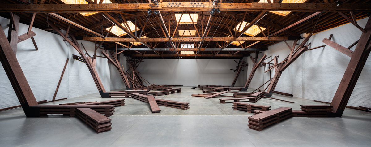 In the second room dozens of thick wooden beams branch across the walls and onto the floor, where they angle out to become benches. A half-dozen or so splintery, Y-shaped wooden forms leaning against the walls suggest broken crosses. Their formal interplay with the vaulted wooden roof brings up thoughts of how industrialization’s infrastructures and networks require standardization, while echoing a deconstructed Nordic spa.