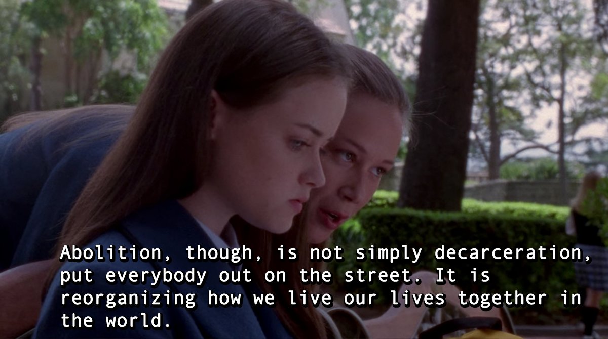 Image courtesy the Ruth Wilson Gilmore Girls Twitter account (@rwgilmoregirls), which repurposes stills from the popular Gilmore Girls TV series to serve as backdrops to quotations from one of the premiere theorists of prison abolition, Ruth Wilson Gilmore. This particular quote is taken from a recent interview with Democracy Now!.