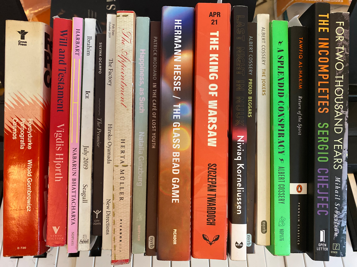 A few of the titles in translation that reside in the managing editor’s living room.