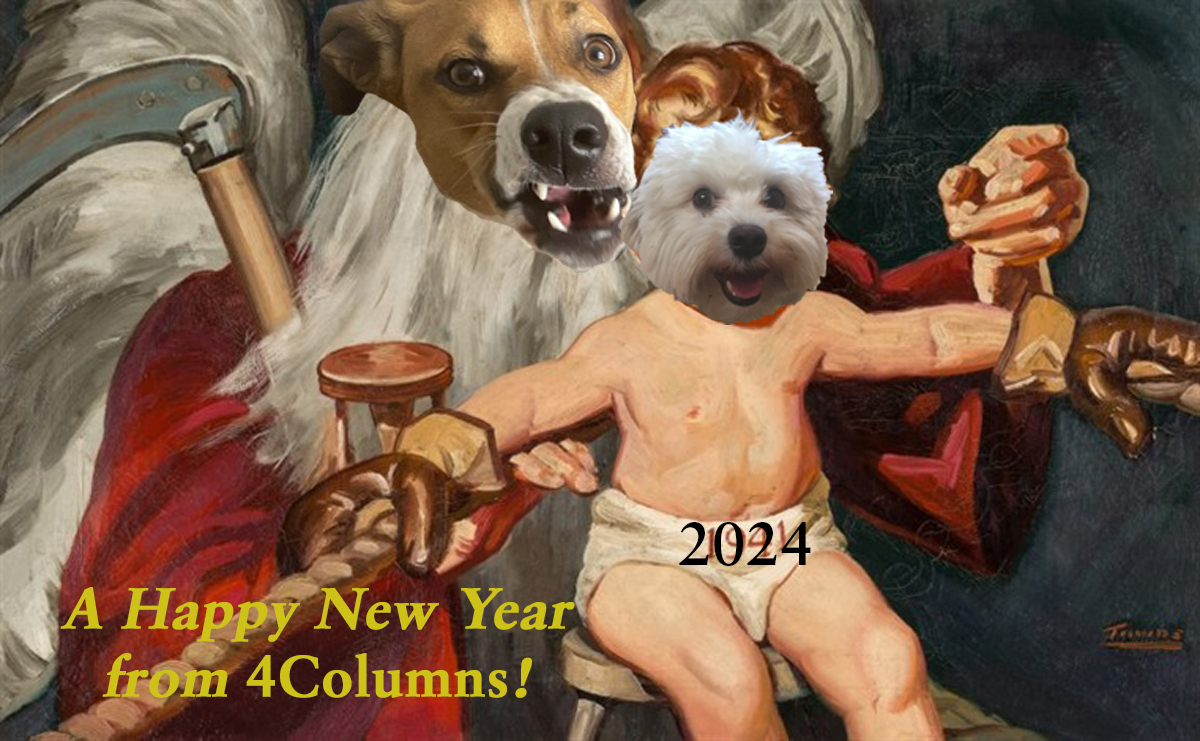 Father Time (4Columns assistant senior editor Bolek) and Baby New Year (our mascot Sparky) are ready to ring in 2024—but first, the top-ten reviews of 2023!