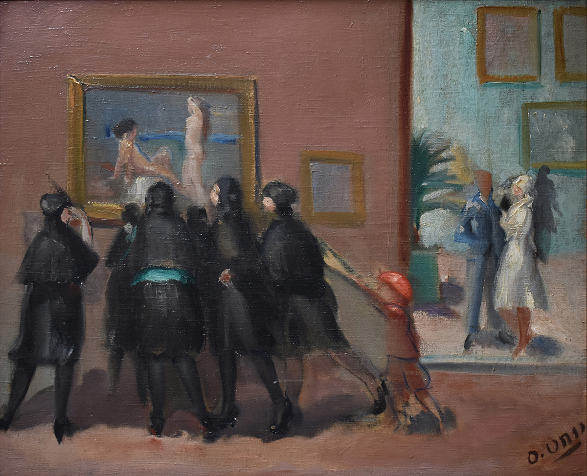 Omar Onsi, À l'Exposition (Young Women Visiting an Exhibition), 1932. Oil on canvas, 17 3/4 × 14 3/4 inches. Courtesy Mir Samir Abillama.