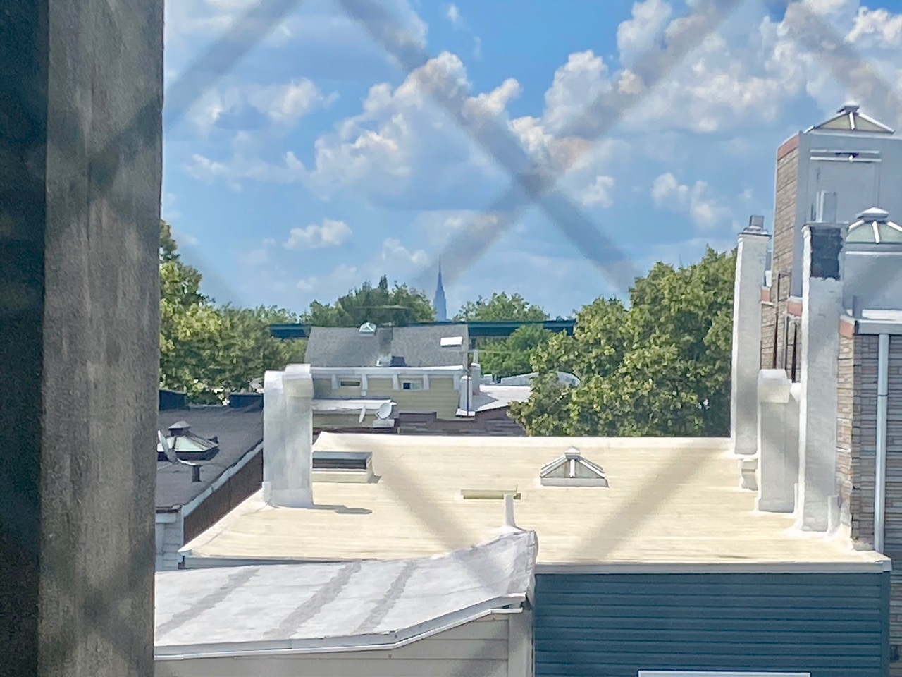The silhouette of the Empire State Building rises in the distance, as viewed from the stairwell window of the managing editor’s apartment building in Queens. She has not been to the city since March 13.