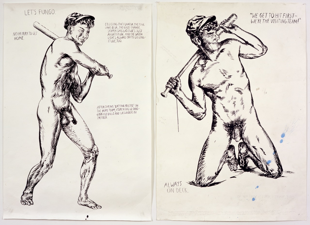 Raymond Pettibon, No Title (Let’s Fungo. No), 2003. Pen and ink on paper; diptych, 59 ½ × 41 ½ inches (each).