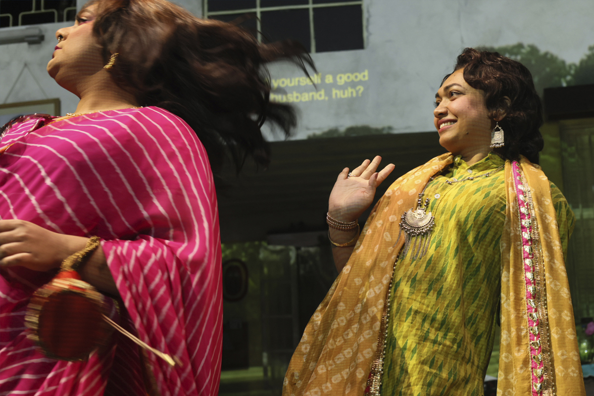 Chowdhury’s tactical withholding of visual information exists in balance with another picture—a moving picture—described minutely by Pishe. Over the kitchen table, Pishe bonds with Raheem (a fellow film buff and admirer of Satyajit Ray, naturally) and relates a movie he once dreamed. In interviews, Chowdhury has said this shot-for-shot reverie his late uncle shared years ago was the genesis of the play. It’s a cryptic suite of scenes involving a space-shifting woman in a green sari and a madman catching flies and putting them in a basket on his head. The exact meaning of the dream is unclear; like much on the periphery of the play, we are invited to participate in interpretation.