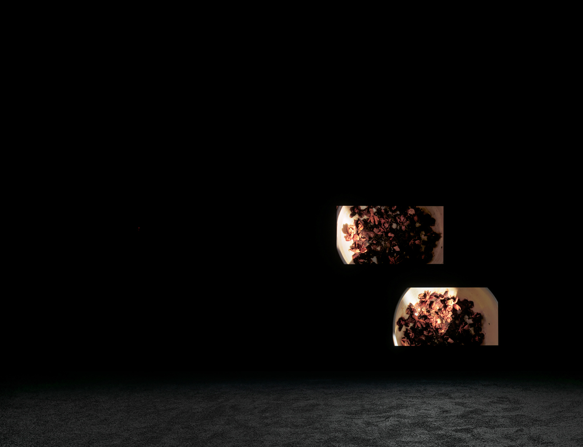 The result is less an origin story than a lyrical mapping of our current state of affairs—though a fragmented, collaged one. Rather than tracing a single, if elusive, narrative, as many of his past film-based projects have, The Peacock’s Graveyard is organized around a series of episodes named for their protagonists: The Priest, The Hangman, The Landlord, The President, and Pabu Holla (a pair of friends). Written by the artist, the stories are adapted from ancient Indian folklore and more modern parables, some imagined or reimagined, and distilled into short stanzas. The text is projected on the wall of an inky black room, synchronized with images that appear and disappear elsewhere on the wall at a studied pace. Other than some archival footage drawn from old Indian movies at the beginning—of a ship on stormy seas and torrential rains, fitting symbols for the world we find ourselves in now—Kanwar shot everything else: nonhuman entities (with one or two exceptions), including flora, fauna, the natural elements, the sky and the earth, an ashtray, and so on.