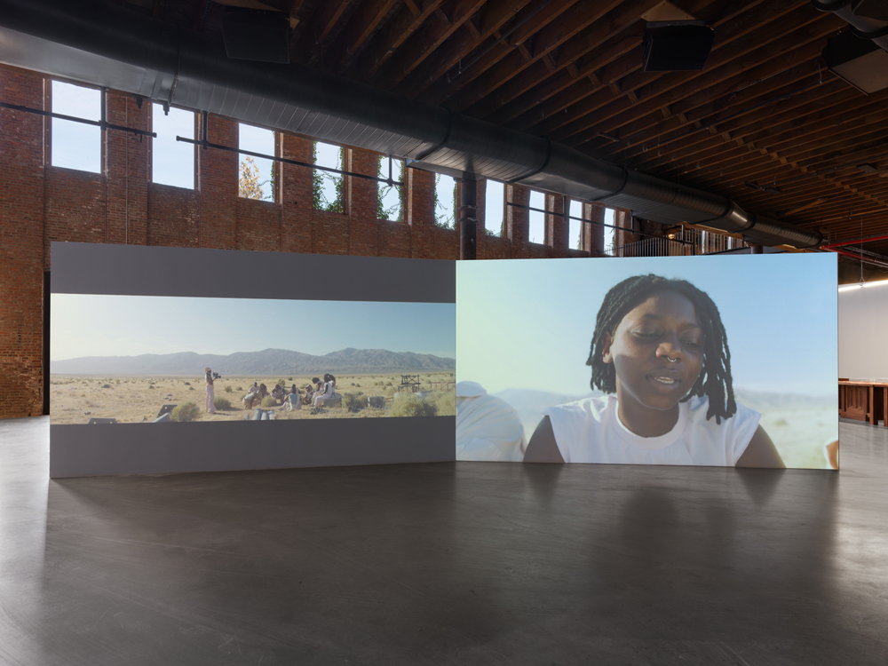 American Artist: Shaper of God, installation view. Courtesy Pioneer Works. Pictured: The Monophobic Response (Film, 2CH), 2024. Two-channel HD video with sound, 18 minutes 19 seconds.