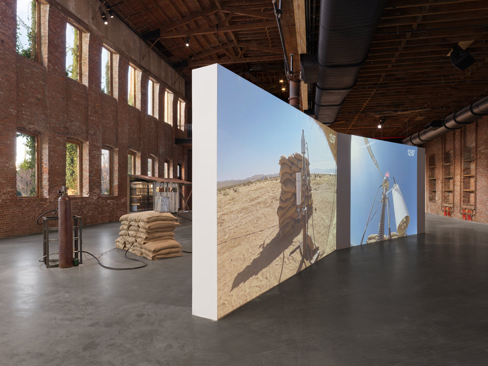 The Monophobic Response is the shared title of two works from 2024, a sculptural installation and a two-channel, wall-size video projection. (The phrase comes from Butler’s 1995 essay about humanity’s fear of difference, and the social relations that are produced from that fear.) The first is a fully functional copy of a rocket engine created by students at the Guggenheim Aeronautical Lab, the precursor of the Jet Propulsion Laboratory, in 1936; the device was originally tested in the Arroyo Seco Canyon, near Altadena. The video shows a group of people gathered by Artist—rocket engineers, scholars of Butler’s work, artists, and friends—operating the same device in the desert; they play the roles of Earthseed members trying to achieve their destiny of traveling to another planet.