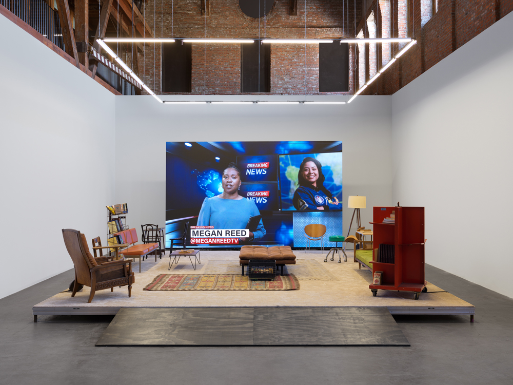 American Artist: Shaper of God, installation view. Courtesy Pioneer Works. Pictured, left: The Monophobic Response (sculpture), 2024. Right: The Monophobic Response (Film, 2CH), 2024.