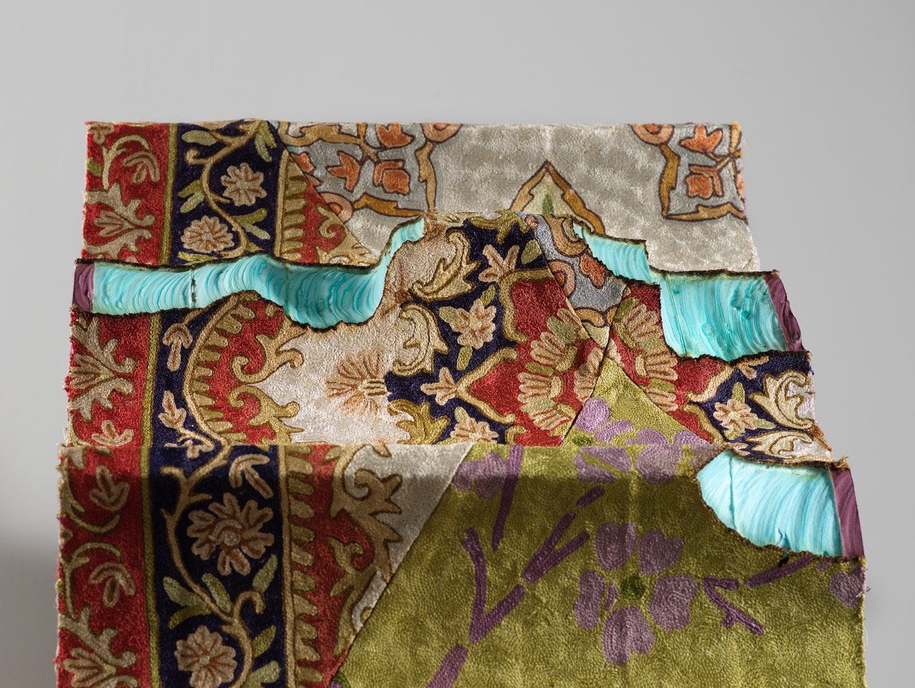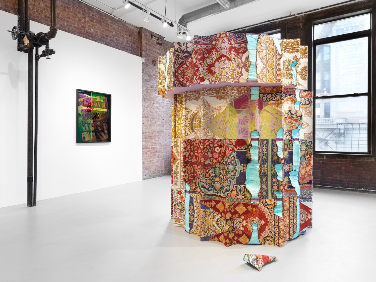 Baseera Khan, Baarwaada, the Oldest Walk, 2019. Acrylic, chromatic prints, custom handmade silk rug pieces made in Kashmir, India, 31 × 25 1/4 inches.