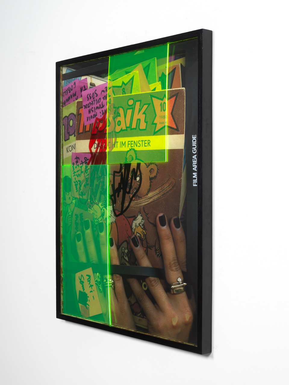 Likewise, the framed collages lining the walls of the gallery refer to the endlessly renewing nature of power, and the constant need to resist—even when that power is wielded by our comrades. To make them, Khan amassed photocopies, books and magazines, and a variety of objects including commercial photo frames, neon sticky notes, and scissors, and placed them on a scanner bed; her own ring-laden hands are often visible resting on the glass. She then overlaid the resulting prints with neon-colored, calligraphic, acrylic cutouts, and framed it all using bits of embroidered carpet as spacers. Her source images are largely drawn from a hugely popular East German comic book series called Mosaik, which began publication in 1955. (The color palette of the Mosaik pages are, if you look closely, precisely echoed in the Kashmiri rugs found elsewhere.) While Mosaik was tolerated by the GDR authorities, who saw it as Disney-esque without the capitalist exploitation attached, its light-hearted narratives of international adventures contained subtle and subversive jabs at the state; some scholars believe it contributed to the fall of the Berlin Wall. But for all the comic book’s stealthy political agenda, Khan is acutely aware of its blind spots: its pages are filled with anti-Semitic and racist caricatures, which the artist “redacts” by placing the semi-transparent acrylic scribbles on top, or screen-printing scribbles over them.
