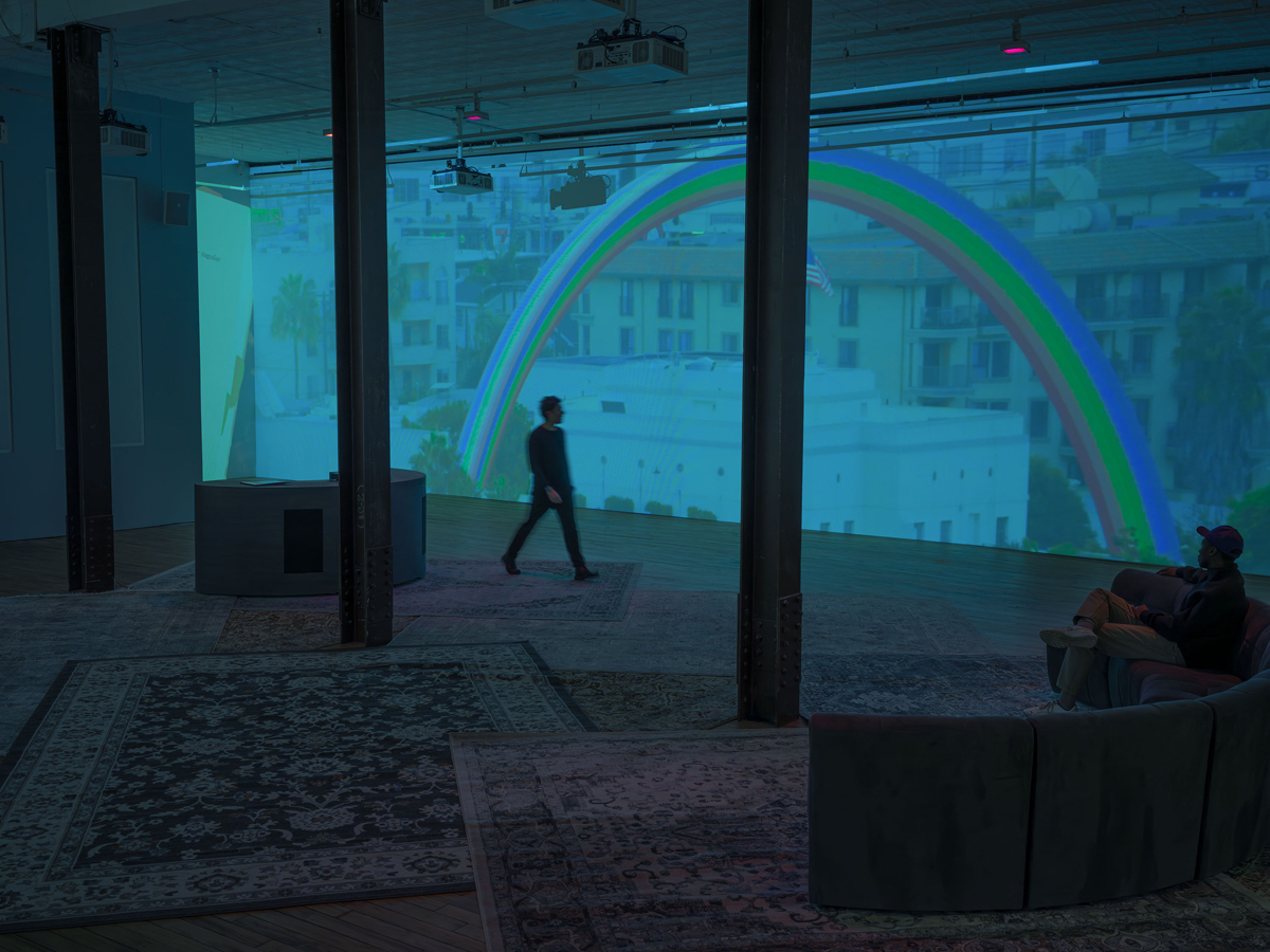 With The Wanda Coleman Songbook, the installation at the center of Cauleen Smith’s latest New York solo show, the artist has transformed 52 Walker into the ideal space for deep listening and slow looking. The floor is covered with worn carpets, the lighting is dim, warm, and inviting, and the couches are remarkably comfortable. It’s a place where you feel like shedding your coat, plopping down your bags, and settling in. Drop the needle on a thirty-two-minute vinyl on the minimalist DJ table, watch the videos projected all around you, take in the scent wafting through the gallery (a mix of grass, eucalyptus, gasoline, ocean salt, flowers, and citrus, from what I could sniff), and find yourself immersed in Smith’s vision of Los Angeles.