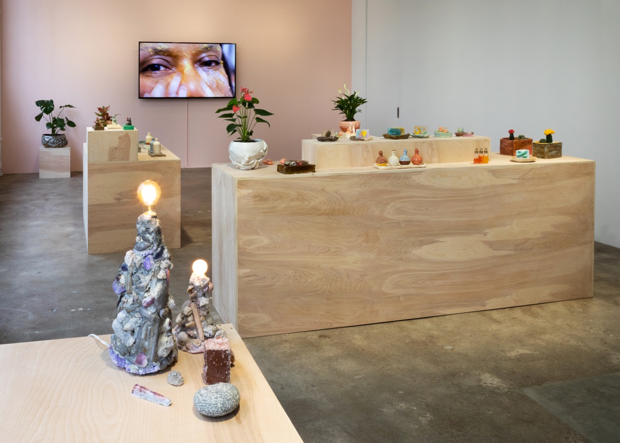 Ms. Harris’s well-manicured fingers range over her bathroom countertop, strewn with all manner of what are clearly handmade beauty tools, devices, vials, and potions; those same objects are on display in the gallery, arranged artfully on stylish wooden plinths, juxtaposed with flowers and plants as in a luxe boutique. (A second room includes an array of soaps lined up on a wall shelf and several collages derived from the pages of wellness magazines.) Made of ceramic and resin, sometimes glazed sloppily and often embedded with found objects and other materials (car air fresheners, neon-orange corn puffs, flowers, sand, grout), these self-care products are utterly useless: the soaps do not lather; the Cheetos face serums—even if you ever wanted to put them on your skin—are cast, solid forms, fused with their vials; the face rollers do not roll; the sponges are not spongy. Many of the tools are present only as absences—we are served up their molds instead of the objects themselves. The sleek, clean, inviting aesthetic of display stands in stark contrast to the abjectness of its offerings.