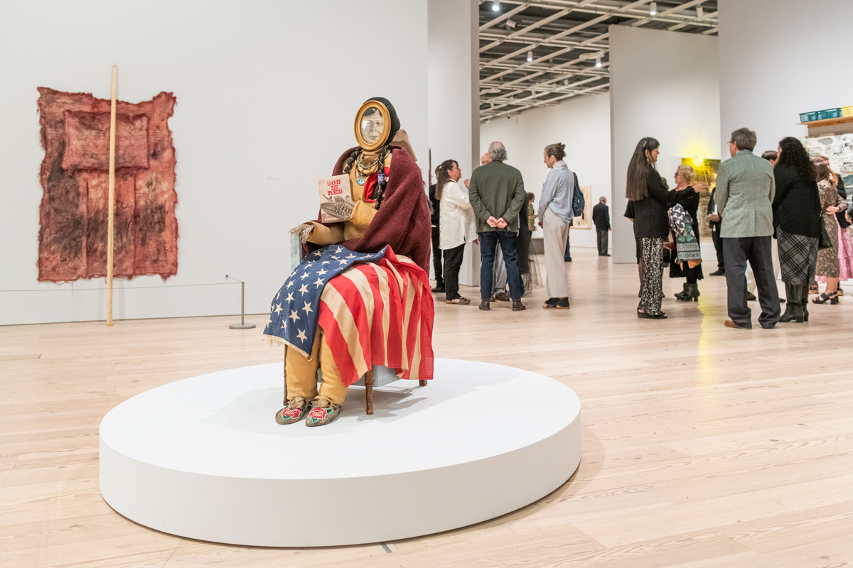 Jaune Quick-to-See Smith: Memory Map, installation view. Courtesy the Whitney Museum of American Art. Photo: Matthew Carasella. Pictured, center foreground: Indian Madonna Enthroned, 1974.