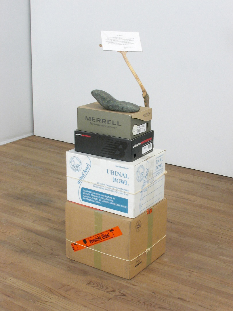 Jimmie Durham, Anti-Brancusi, 2005. Cardboard, wood, serpentine stone, rope, ink on paper, 48 × 17 × 31 ⅛ inches. Image courtesy collection of Michel Rein.