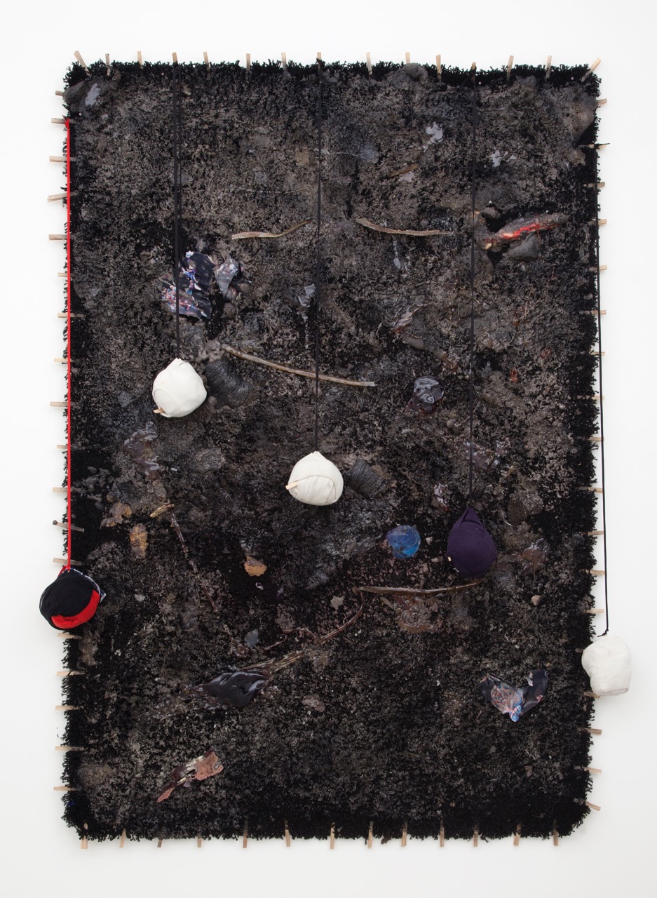 Kevin Beasley, Untitled, 2014. Shag rug, polyurethane foam, resin, clothes pins, thermal shirts, underwear, and studio debris, 80 × 50 × 5 inches. Image courtesy the artist and Casey Kaplan Gallery. Photo: Jean Vong. © Kevin Beasley.
