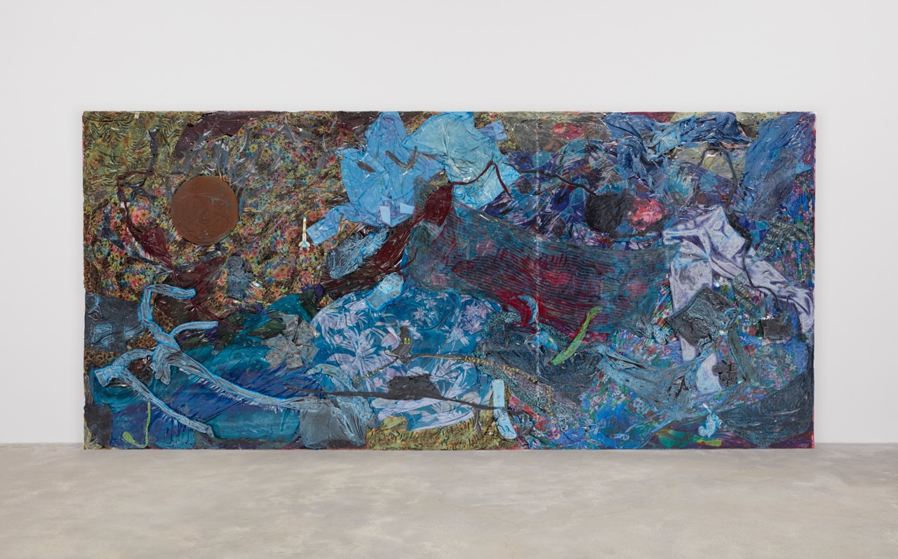 Kevin Beasley, A View of a Reflection, 2017. House dresses, kaftans, t-shirts, socks, du-rags, bandanas, altered garments, altered fitted caps, altered bed sheet, mouth guards, feathers, and resin, 82 ¼ × 178 × 5 ¼ inches. Image courtesy the artist and Casey Kaplan Gallery. Photo: Jason Wyche. © Kevin Beasley.