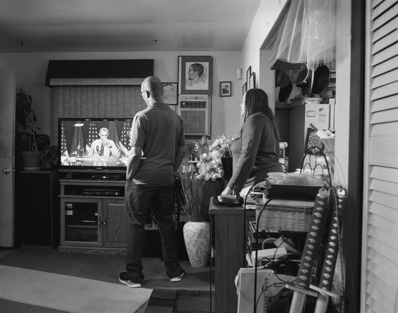 LaToya Ruby Frazier, Shea’s Aunt Denise and Uncle Rodney in their home on Foster Street watching President Barack Obama take a sip of Flint water, 2016. Gelatin silver print. Image courtesy the artist and Gavin Brown’s enterprise.