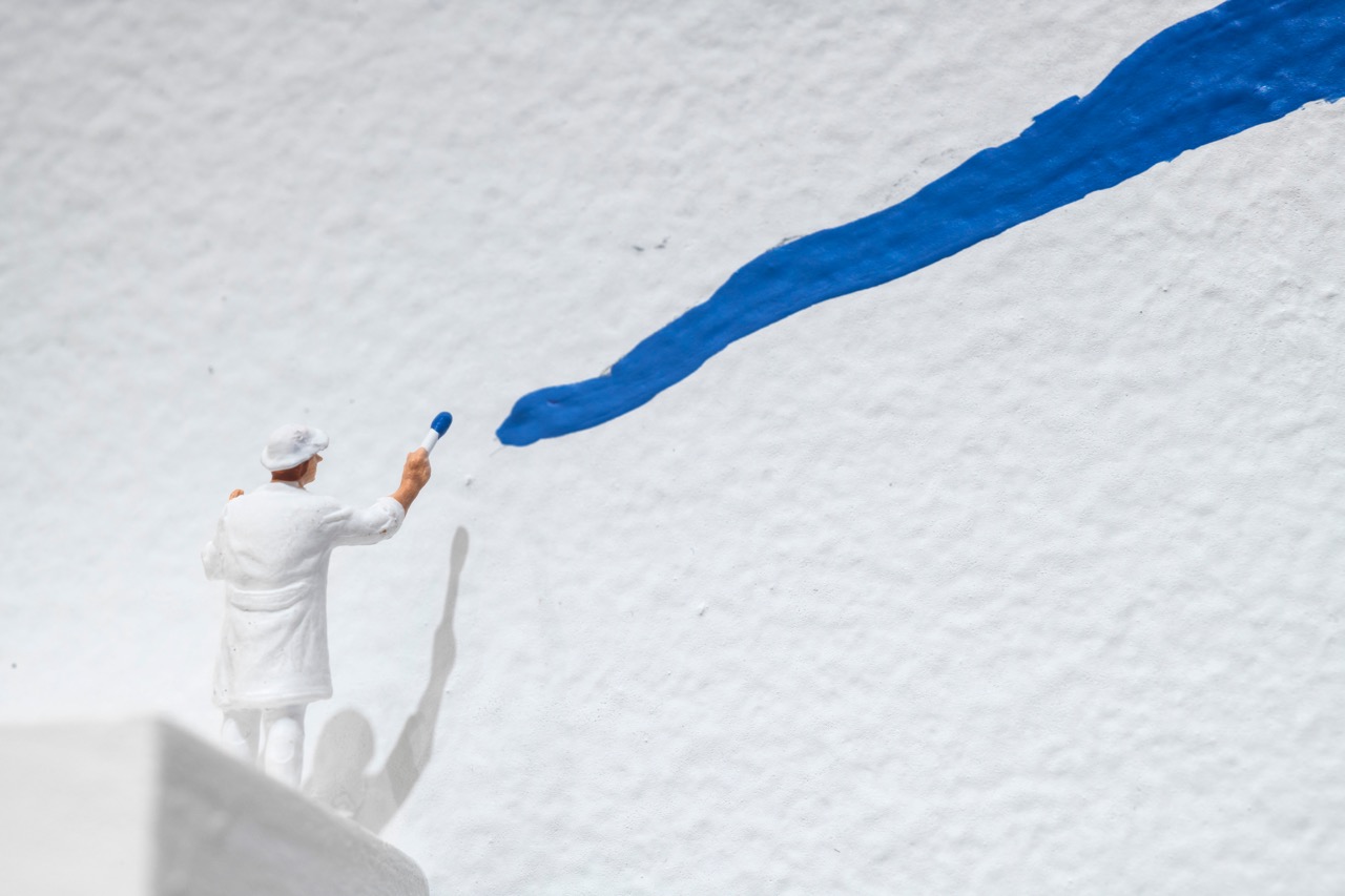 In the handful of galleries that make up the elegantly hung and expansive-seeming show, we are confronted with several small installations centered on tiny people-substitutes undertaking impossibly huge tasks. A small man in a white smock is mounted on a wooden block on one wall; from his paintbrush seems to emanate a French blue swath of paint that grows bigger and bigger, enveloping a good part of two walls of the room (Man Painting, 2018). Nearby, another figure begins the herculean job of painting a leg of a full-sized chair, many, many times his height, that same shade of blue (Untitled [Man Painting Chair III], 2015). In Man with Pickaxe (2017), a miniscule man chips away at the long wooden plinth on which he stands (it must be at least eight feet long to his inch or so height), presumably intent on destroying his own foundation. Forced Labor (Sweeping Woman) (2004–18) has a woman in a green skirt and straw hat cleaning up a spill of blue sand that stretches almost endlessly before her. Another woman, all in pink, sits on a tiny bench, knitting; the result of her efforts is the delicate mound of pink fabric that covers most of the large white box on which she is installed (The Weaver, 2017). One man tries to tune a smashed toy piano many times his size (The Task [Black Piano], 2016), while another tries to wind a crushed clock (To Fix it 3:30, 2016).