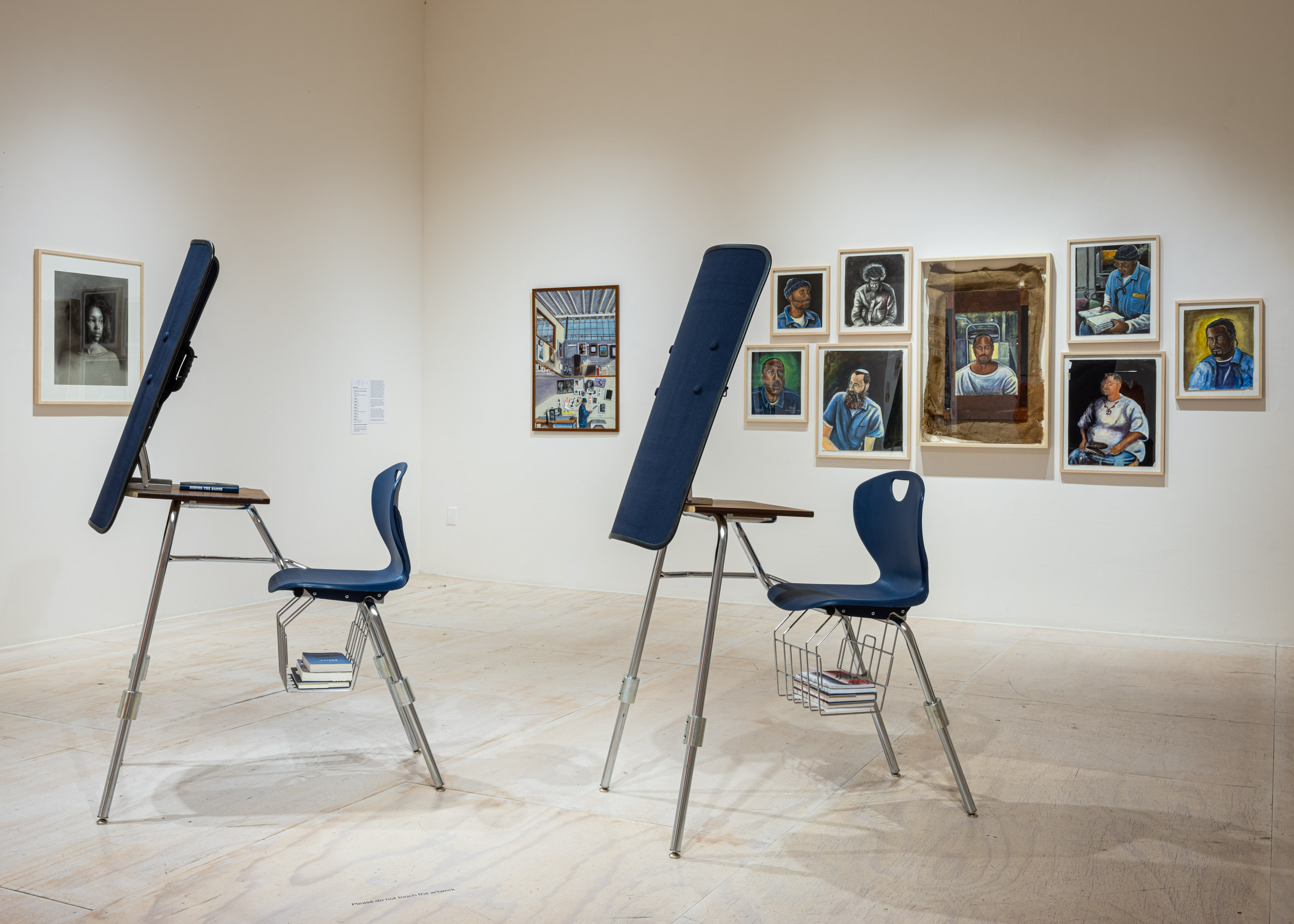 Marking Time’s critical approach to “inside” and “outside” complicates questions of “guilt” (and therefore deserving of imprisonment) and “innocence,” too. In her book, Fleetwood notes that she chooses not to disclose the reason for the artists’ incarceration (unless they specifically request it) because definitions of criminality are mutable and socially and politically constructed. The gap between “incarcerated” and “guilty” is underlined by Maria Gaspar’s inkjet prints of a Google Earth tour of Chicago’s Cook County Jail, whose largely Black inmates have been detained not because they’ve been convicted of a crime, but because they cannot afford cash bail (Wretched and Paramount I to VI, 2014–16). American Artist’s I’m Blue, 2 and I’m Blue, 3, both from 2019, nod to the mechanisms of criminalization and the question of who is culpable and who is victimized. The artist mounts police ballistic shields to the front of school desks and fills the desks’ wire baskets with books, mostly written by retired officers, addressing how hard police work is on their emotional well-being; the piece suggests the ways in which we are indoctrinated to sympathize with members of a system that perpetrates violence on Black and brown communities in the name of law and order. Meanwhile, Jared Owens’s triptych Ellapsium: master & Helm (2016) includes an abstracted but unmistakable rendering of a famous 1788 image of Africans imprisoned in the hold of a slave ship; next to it, The Go Back (2020) incorporates a found piece of signage that he has modified to read something like “40 acres / 40 years / Classic.” The references to slavery, and the idea of prisons as a new form of plantation—or as the New Jim Crow, as legal scholar and civil-rights lawyer Michelle Alexander puts it—point up how incomplete the project of emancipation is.