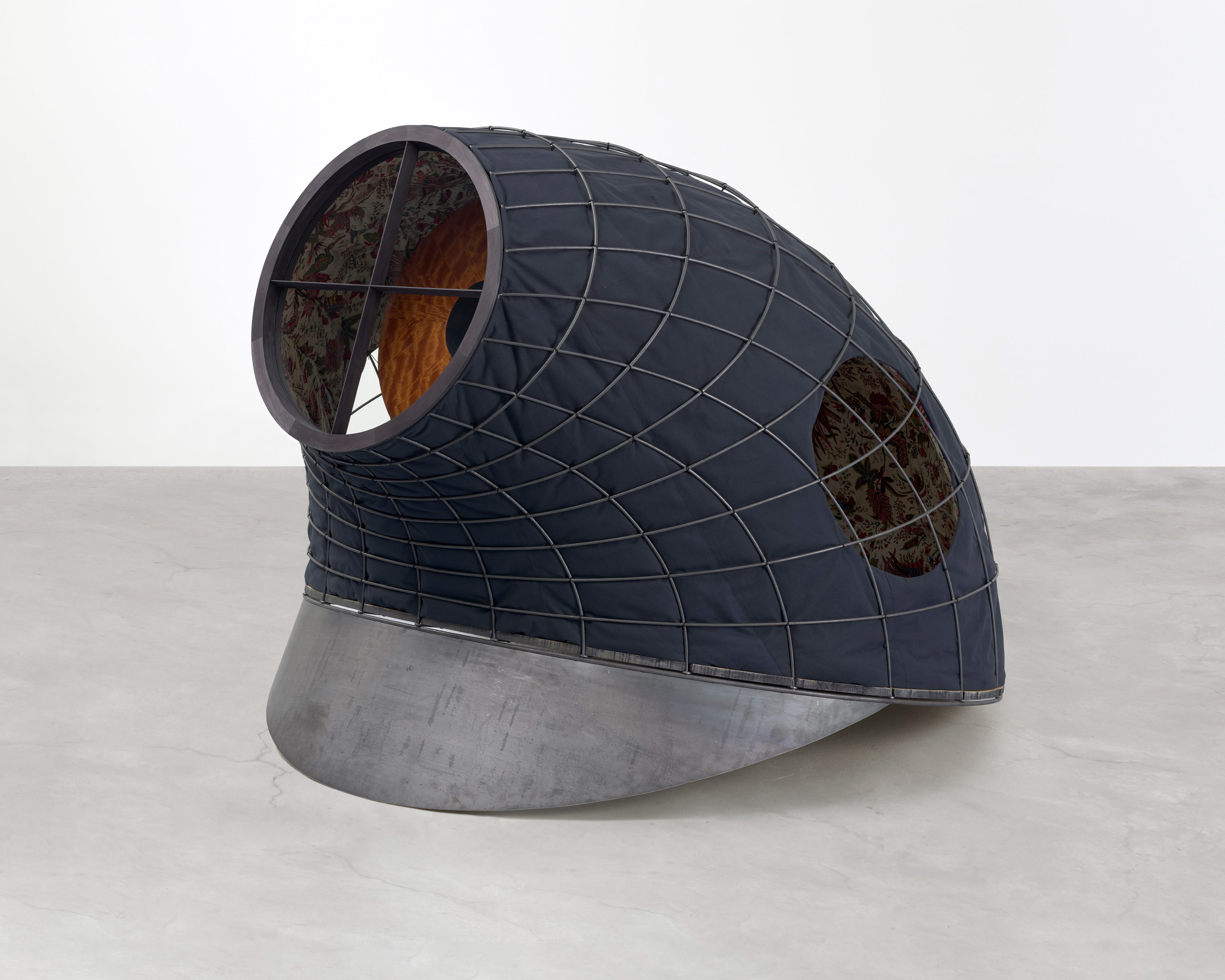 Martin Puryear, Tabernacle, 2019. Steel, red cedar, American cypress, pine, makore veneer, canvas, printed cotton fabric, glass, stainless steel, 74 × 90 × 96 inches. Courtesy Matthew Marks Gallery.