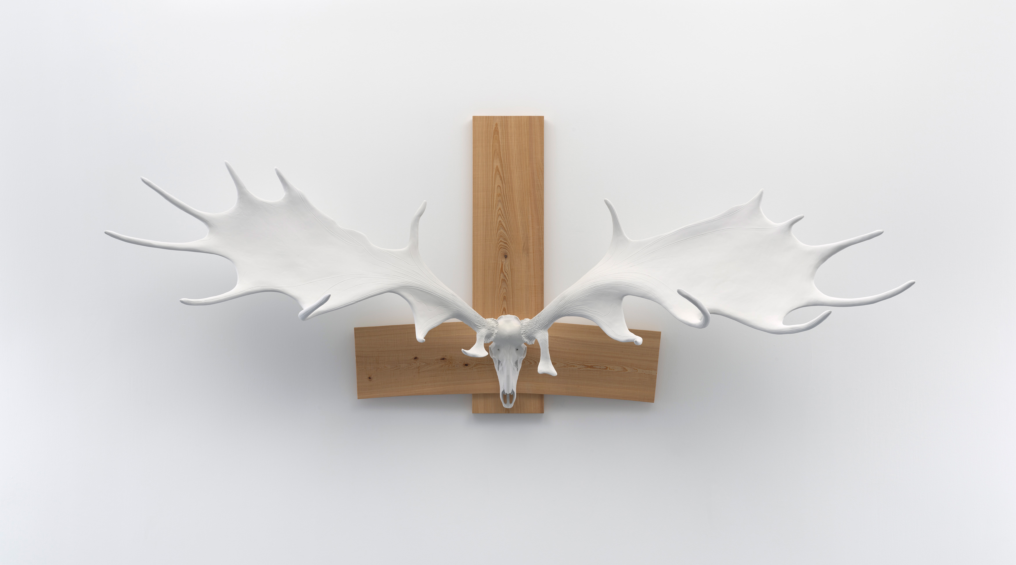 Hibernian Testosterone (2018) is a meditation on toxic masculinity: on an inverted cross hewn from American cypress, we find an absurdly large set of white-painted antlers. Cast in aluminum, this is a full-scale reproduction of the skull of an Irish elk, an Ice Age animal that went extinct in part because of the havoc testosterone played, prompting the growth of larger and larger horns to survive combat with other males of its species and to attract mates; carrying such weight taxed its energy so much that the species could not sustain itself. But of course, the way this almost twelve-foot-wide fossil is mounted alludes to another form of toxic masculinity, namely trophy hunting—one of the reasons for today’s crisis of mass extinctions.