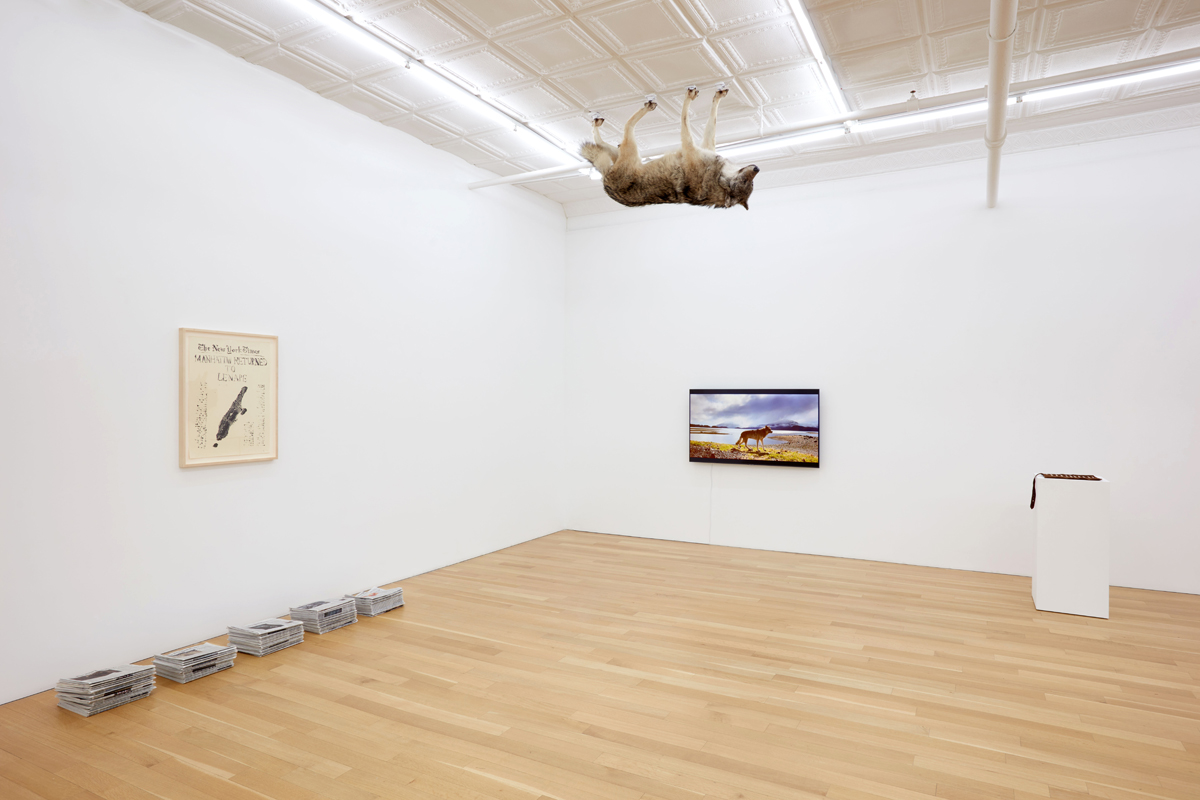 While I might not be the person called to action by Purchase, I am still positioned in relation to the devastating and violent histories and present situations to which it and other works refer as a perpetrator, abettor, passive bystander, or privileged ignoramus. This, to me, is the power of Galanin’s approach—his art makes me squirm. World Clock is composed of a framed monoprint of the front cover of the New York Times bearing an image of Manhattan Island and a blaring, imagined headline—“MANHATTAN RETURNED TO LENAPE”—below which, on the floor, sit piles of the actual paper of record. The piece records an endless wait (the stacked issues mark the passing of time) for an utterly improbable event, and simultaneously manifests such a wish for the land’s return to its original caretakers by speaking it out loud. That speech act seems a pointed rejoinder to the now-familiar land acknowledgements recited at the beginning of every art-world gathering and other liberal lip service to the Land Back movement. World Clock kneecaps such performative gestures by confronting viewers with an actual, concrete form of repair, and forcing them to sit with the question of what such a future might look like.