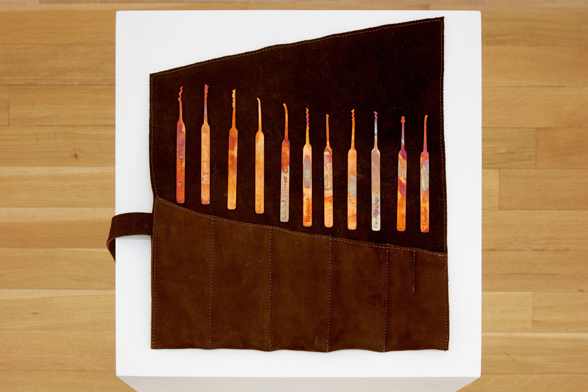 Nicholas Galanin, Purchase, 2022. Hand-engraved copper and leather tool bag. Courtesy Peter Blum Gallery.