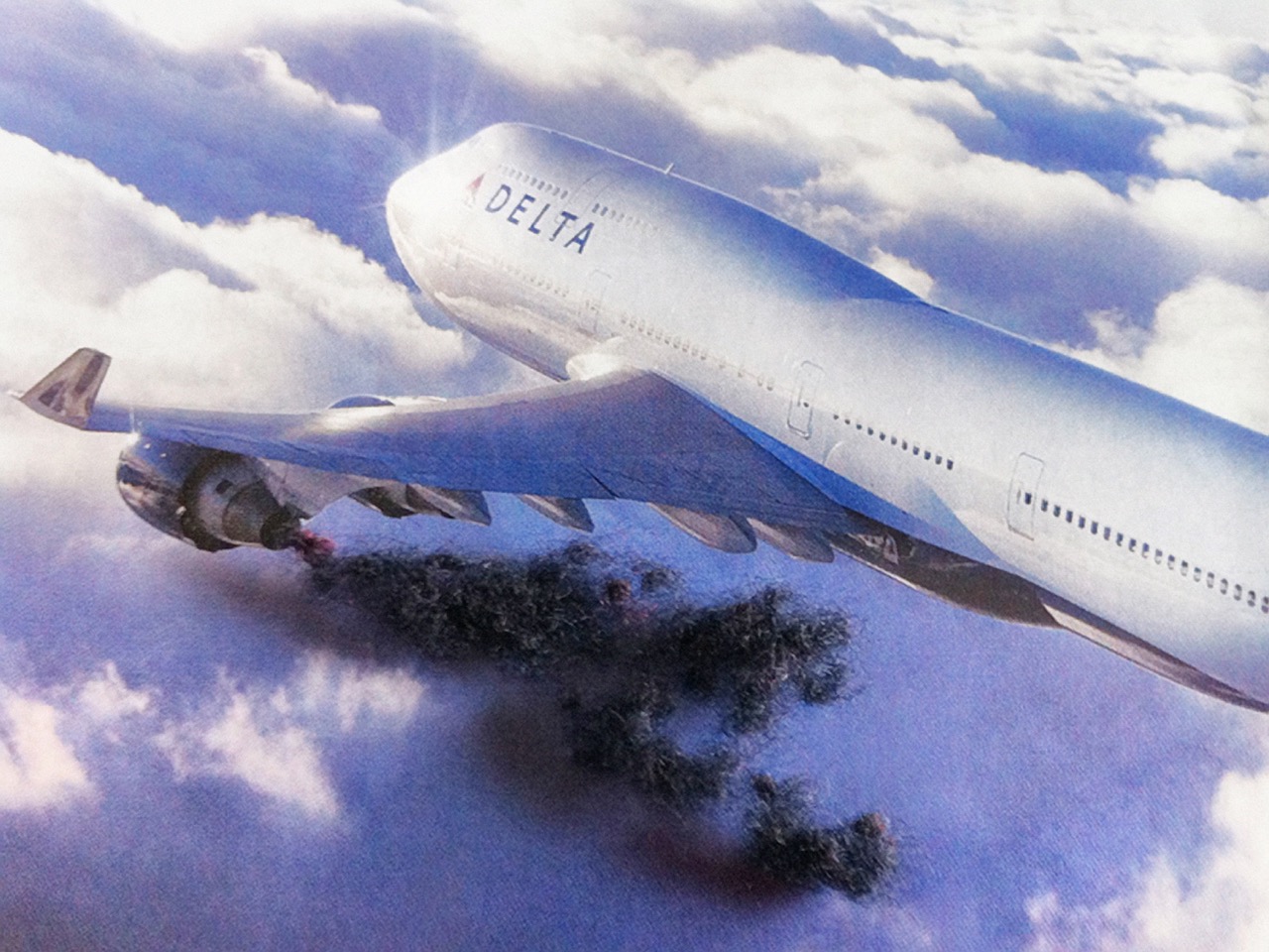 Nina Katchadourian, Engine Failure, 2011 (from Seat Assignment, 2010–ongoing). C-print, 19 × 24 inches. Image courtesy the artist, Catharine Clark Gallery, and Pace Gallery.