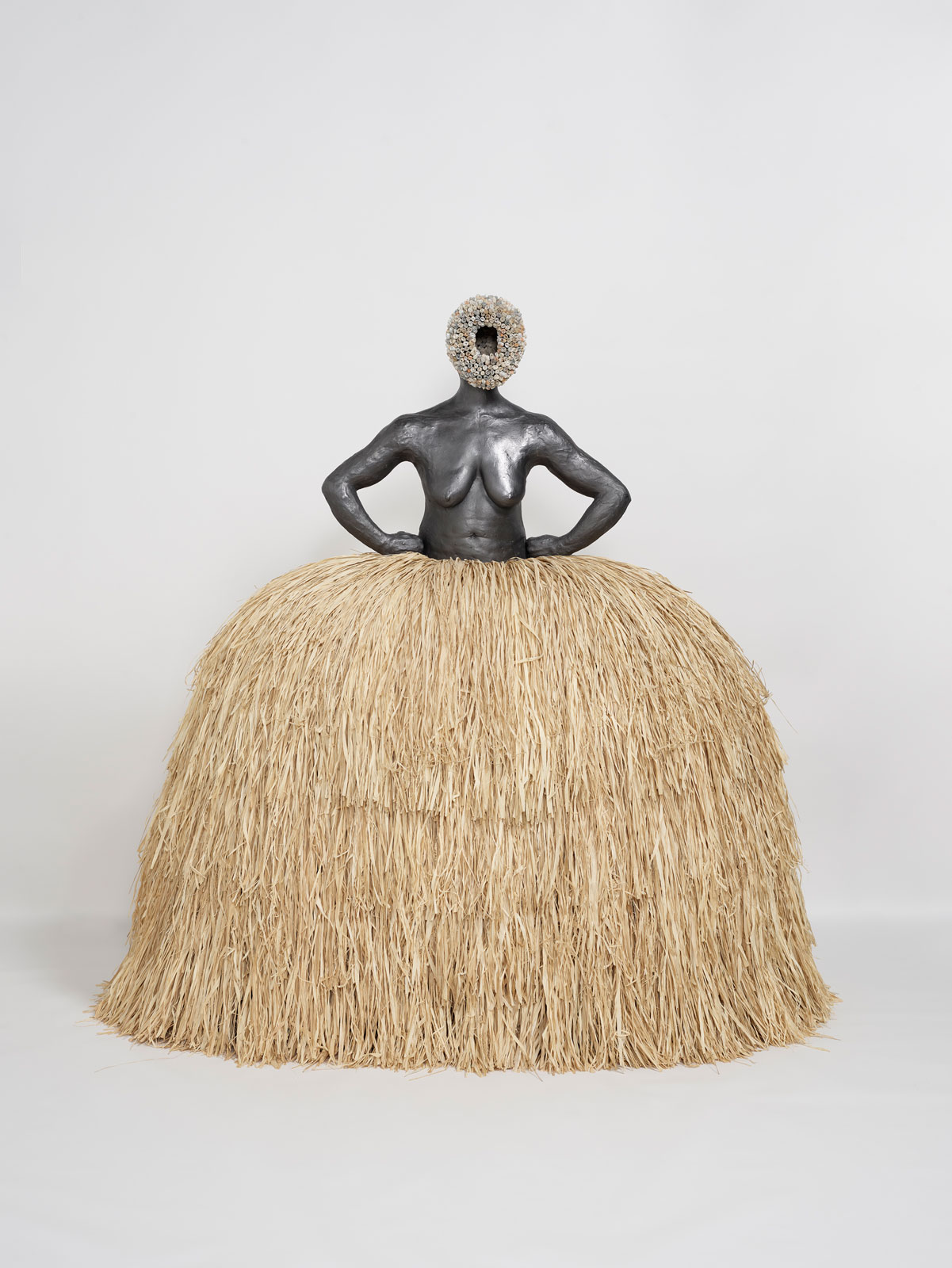 Simone Leigh, No Face (Pannier), 2018. Terracotta, graphite, salt-fired porcelain, steel, raffia, 72 ⅝ × 75 × 58 inches. © Simone Leigh. Image courtesy the artist and Luhring Augustine.