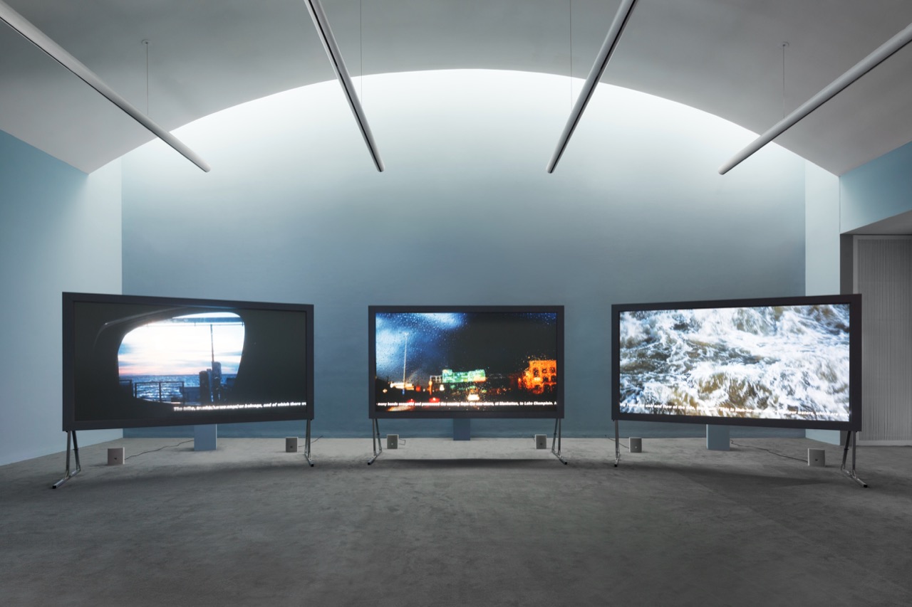 The juxtapositions Hopinka relies upon in his single-channel videos are given new form in his three-channel installation Here you are before the trees, which was commissioned by Bard College and explores the Indigenous history of the land on which it sits through the prism of Hopinka’s own lived experience. The piece starts with text, on each screen, announcing what we will be seeing: “This is the Mahicannituck,” “This is the road,” “This is the Waaziija.” The titles give way to images of the Hudson River (the Mahicannituck), the lands of the Ho-Chunk Nation (the Waaziija), and the travel along highways linking the two. The relationship between those places is both deeply personal for the artist—the Waaziija is where Hopinka’s grandmother lived (she makes an appearance in the video), and the Mahicannituck is just by where he now lives and works—and terribly historical, the result of the relocation of the Stockbridge-Munsee Band of Mohican Indians to Waaziija territories.