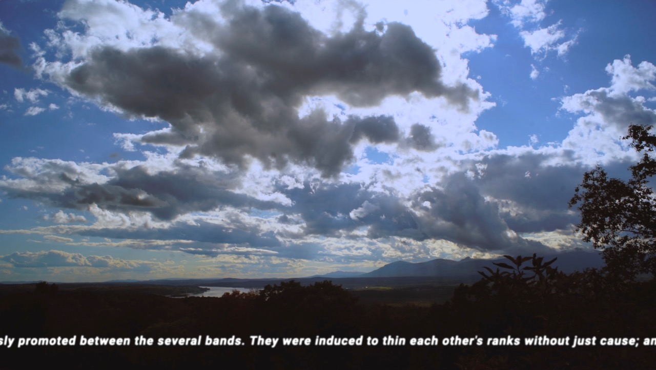 Scrolling across the bottom of the three screens is a transcription of an 1854 oration by John Wannuaucon Quinney, addressing the colonists’ crime of ejecting people from their lands. Meanwhile, along with Hočąk songs and the sounds of the landscapes, we hear recordings of lectures by writer and activist Vine Deloria Jr. (from the 1970s) and scholar Renya K. Ramirez (from the 2010s) talking about how anthropologists and ethnographers pushed the idea of the essential connection of Indigenous people to their land as a way to further alienate the dislocated from their cultural identities.