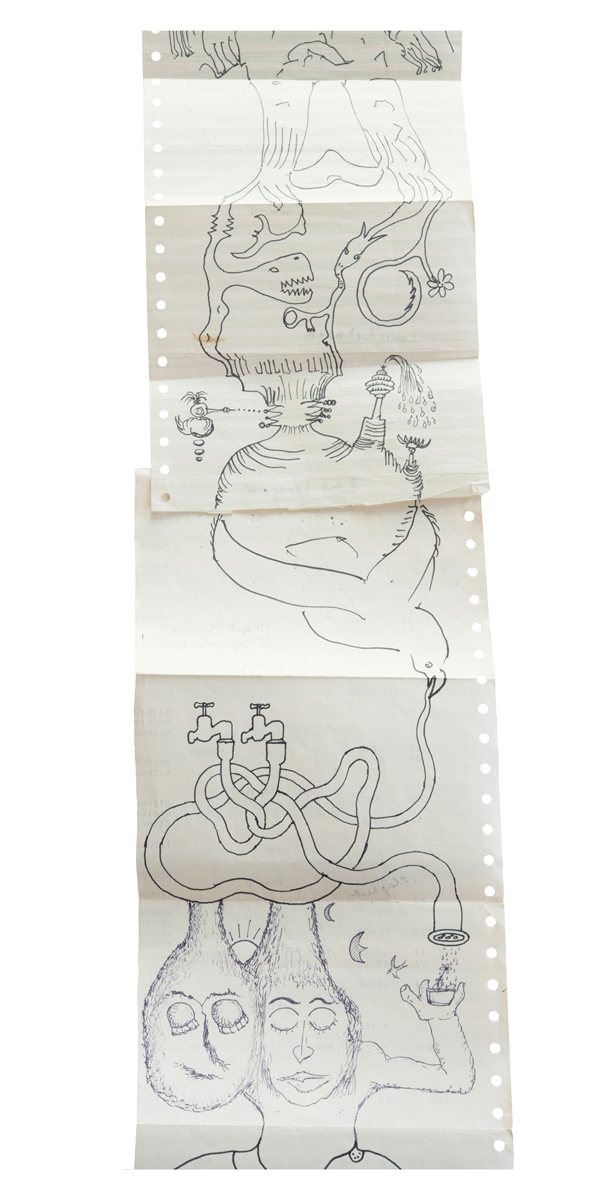 Indeed, the way Black artists—in the Caribbean, in the US, in Africa—mined Breton’s aesthetic notions is one of the most fascinating aspects of the show, especially in the case of Ted Joans. The African American jazz poet, trumpeter, and painter discovered the movement when he was a boy thanks to the copies of Minotaure (a Surrealist magazine published in Paris in the 1930s) that his aunt would bring back from her white employers living in Cairo, Illinois. He melded the ideas he found in its pages with many others to advance his goals, which were bigger than Breton, bigger than Surrealism, bigger than art: “I am Maldoror, Malcolm X, the Marquis de Sade, Breton, Lumumba,” he wrote. “They are my fuel, my endurance, and I will continue to use all the means to win my freedom, which will become freedom for all. Black Power is a means to achieve this freedom.” Among his paintings, drawings, altered photographs, and books is the show’s most compelling cadavre exquis: Long Distance (1976–2005), made of old-school perforated computer paper. Joans would take the drawing with him on his music tours, or mail it to people he had met on his travels, so they could add to it; though he died in 2003, the piece continued to circulate, with further additions, for two years—a poignant reminder that the project was bigger than one man.