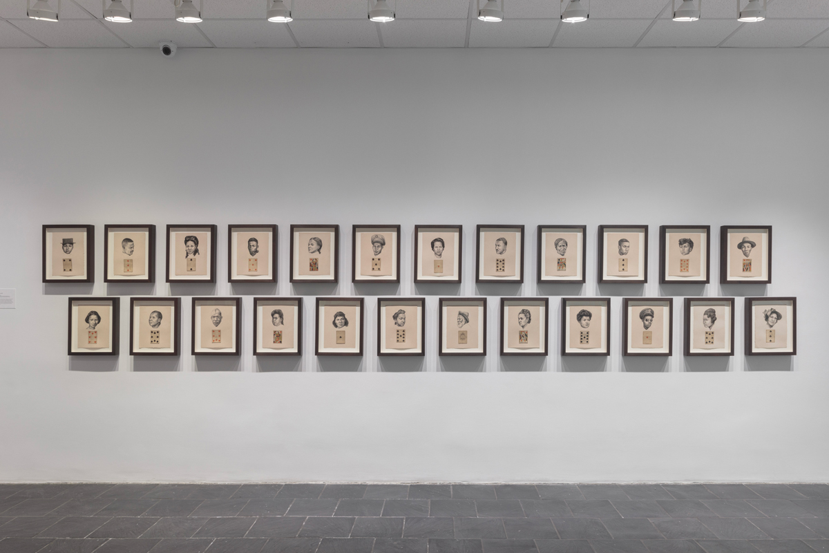 The Black Index, installation view. Courtesy Leubsdorf Gallery. Photo: Stan Narten. Pictured: Whitfield Lovell, The Card Pieces, 2020.