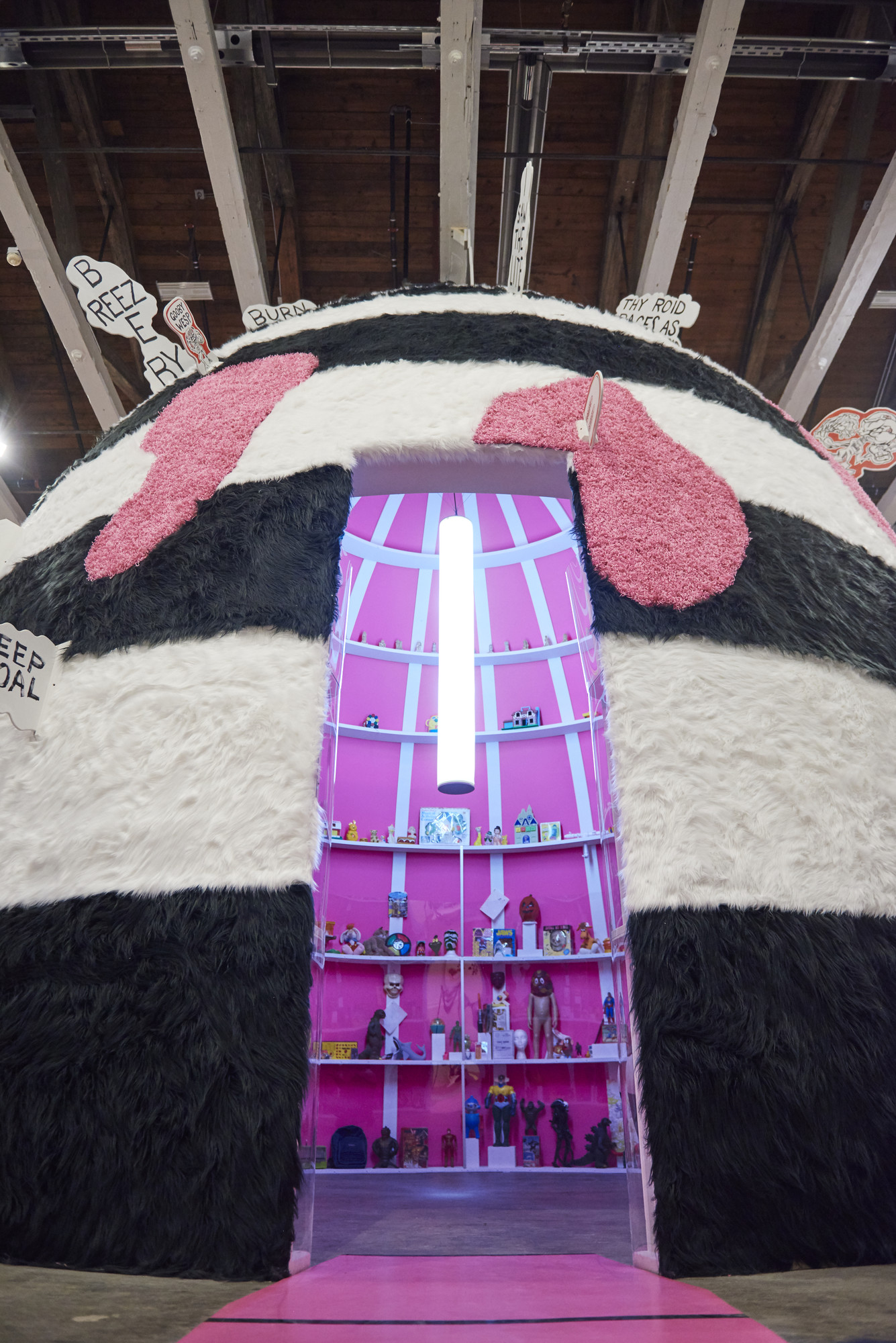 Next up is the Mound Museum, a black-and-white-striped, fake-fur-covered yurt topped with a rodent’s screaming head, which is being assaulted by flat, cutout board game pieces trying to climb its exterior. (These are the dreaded Vegans.) The Mound Museum’s Pepto-Bismol pink interior is calmer, chock-full of Hancock’s own, seemingly bottomless, collection of toys, arranged on shelves according to a clearly present but not entirely obvious taxonomy. Interspersed are the artist’s old school assignments—English worksheets where he was asked to describe a setting for his own story (one can see the seeds of the Moundverse sprouting), math tests, and so on.