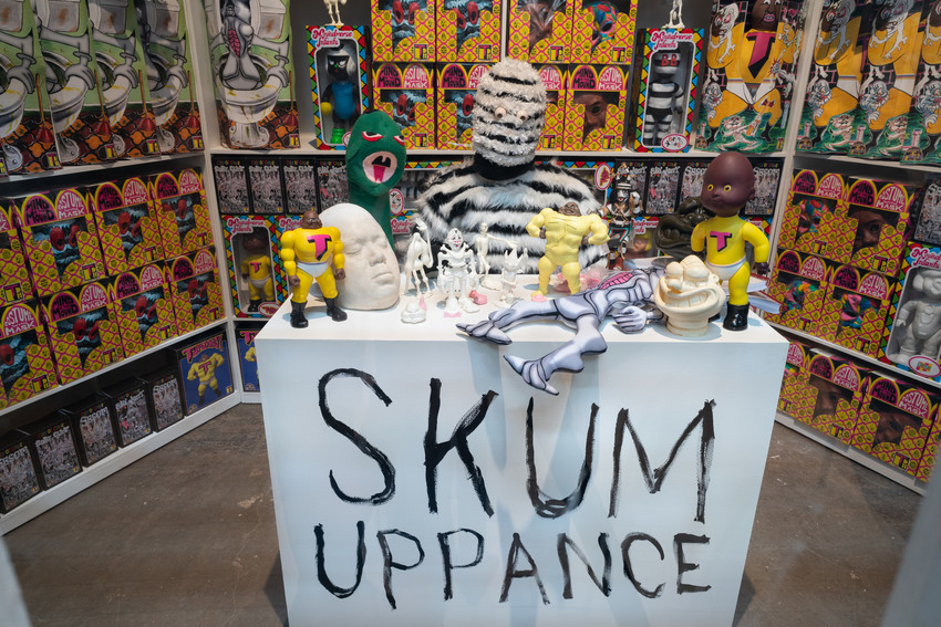 Trenton Doyle Hancock’s current installation, Mind of the Mound: Critical Mass, is one of the best shows I’ve seen in the challenging gallery. It succeeds because Hancock’s vision is sufficiently epic to require the square footage. The project is a materialization of a fantasy world the artist has been fleshing out since the age of ten, when he created his alter ego Torpedo Boy, who wears his tighty-whities over his spandex superhero getup. Over the years, Hancock has drawn upon a vast array of sources—comic books (R. Crumb definitely, and perhaps Ralph Bakshi), Greek mythology, Carl Jung, the history of art (George Grosz, Henry Darger, Philip Guston, and Claes Oldenburg), pop culture (Pee-wee’s Playhouse, the Marvel franchise, video games, and Hollywood movies), Afrofuturism, his own autobiography—to conjure a world populated by what he calls “Mounds.” These creatures, networked by an underground root system, are part plant, part human, and function, in the artist’s words, as “natural depositories for memories and other bits of discarded humanity.” In a nod toward the battle between good and evil that marks almost every superhero story and children’s adventure tale, these creatures are under threat from the evil Mound-eating Vegans and rather ineptly protected by Torpedo Boy.
