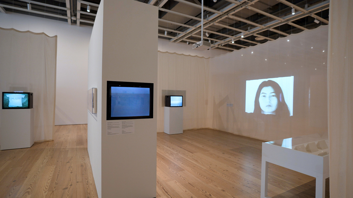 Whitney Biennial 2022: Quiet as It’s Kept, installation view. Courtesy the Whitney Museum of American Art. Pictured, left to right: Theresa Hak Kyung Cha, The Word, 1975; Mouth to Mouth / Vide o me / Re Dis Appearing, 1987; White Dust From Mongolia, 1980; Permutations, 1976.