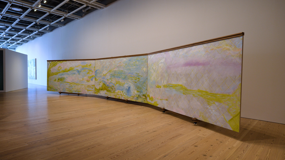 Whitney Biennial 2022: Quiet as It’s Kept, installation view. Pictured: Leidy Churchman, Mountains Walking, 2022. Oil on linen, handcrafted wood easel, three canvases, 6 1/2 × 13 feet each. Courtesy the artist, Rodeo, and Matthew Marks Gallery.