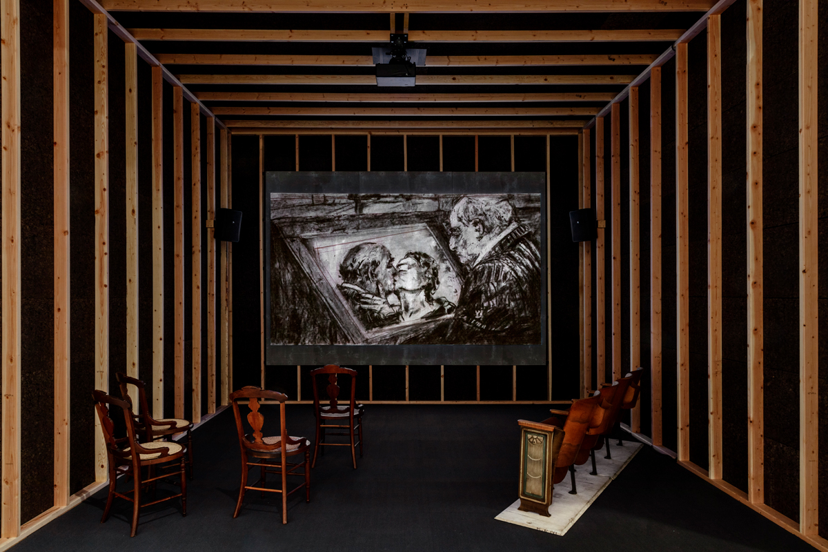 William Kentridge: In Praise of Shadows, installation view. Courtesy the Broad. Photo: Joshua White / JWPictures.com. Pictured: City Deep, 2020. HD video.