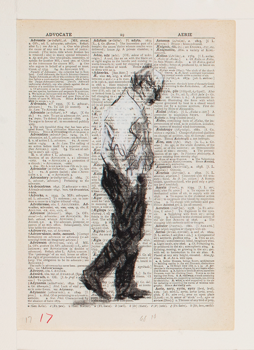 William Kentridge, Let Us Enter the Chapter, 2013 (detail of diptych). India ink, charcoal, pastel, and digital print on Shorter Oxford English Dictionary paper tabbed to Velin d’Arches 400 gsm paper. Courtesy the Broad.