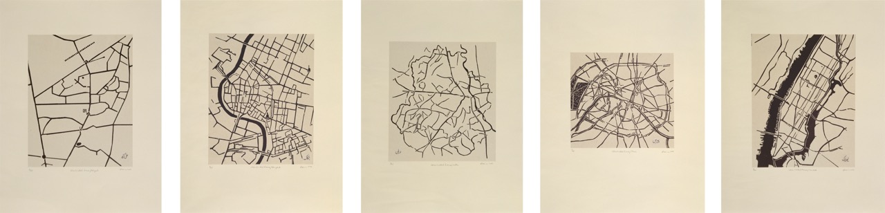 Zarina, Cities I Called Home, 2010. Portfolio of 5 woodcuts and text printed in black on handmade Nepalese paper, dimensions variable. Image courtesy the artist and Luhring Augustine.