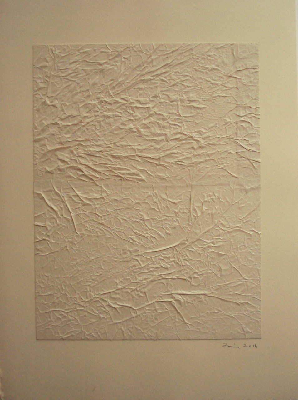 But this movement, this exilic condition, involves a constant refashioning, a prospect either exhilarating or exhausting. Starting Over (2016) depicts this complexity in the most extraordinarily succinct way: it consists only of a sheet of handmade paper that is crumpled up tightly and then smoothed flat again. You can see the wrinkles; you can practically feel the gestures of the hands that pressed it gently and repetitively to erase the signs of what it’s been through. How to read this gesture? As an act of near-destruction, in which the pristine paper is forever marked by the pressures to which it has been subjected, or a record of resilience, whereby the sheet is made infinitely more fascinating by the tracery of wrinkles on its surface? The answer surely depends, in part, on where you’ve come from, and how you got there.