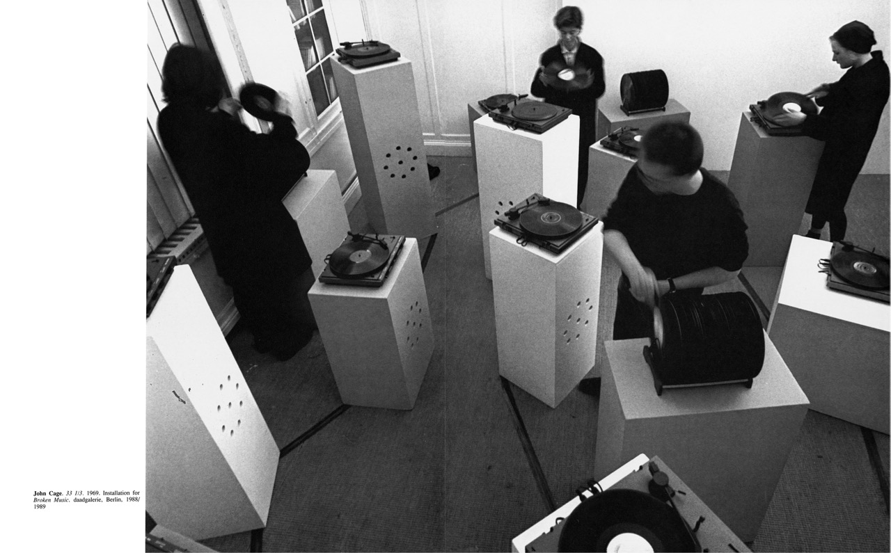 John Cage, 33 1/3, 1969. Installation for the Broken Music exhibition at daadgalerie, Berlin, 1988/1989. Image from the pages of Broken Music, courtesy Primary Information.