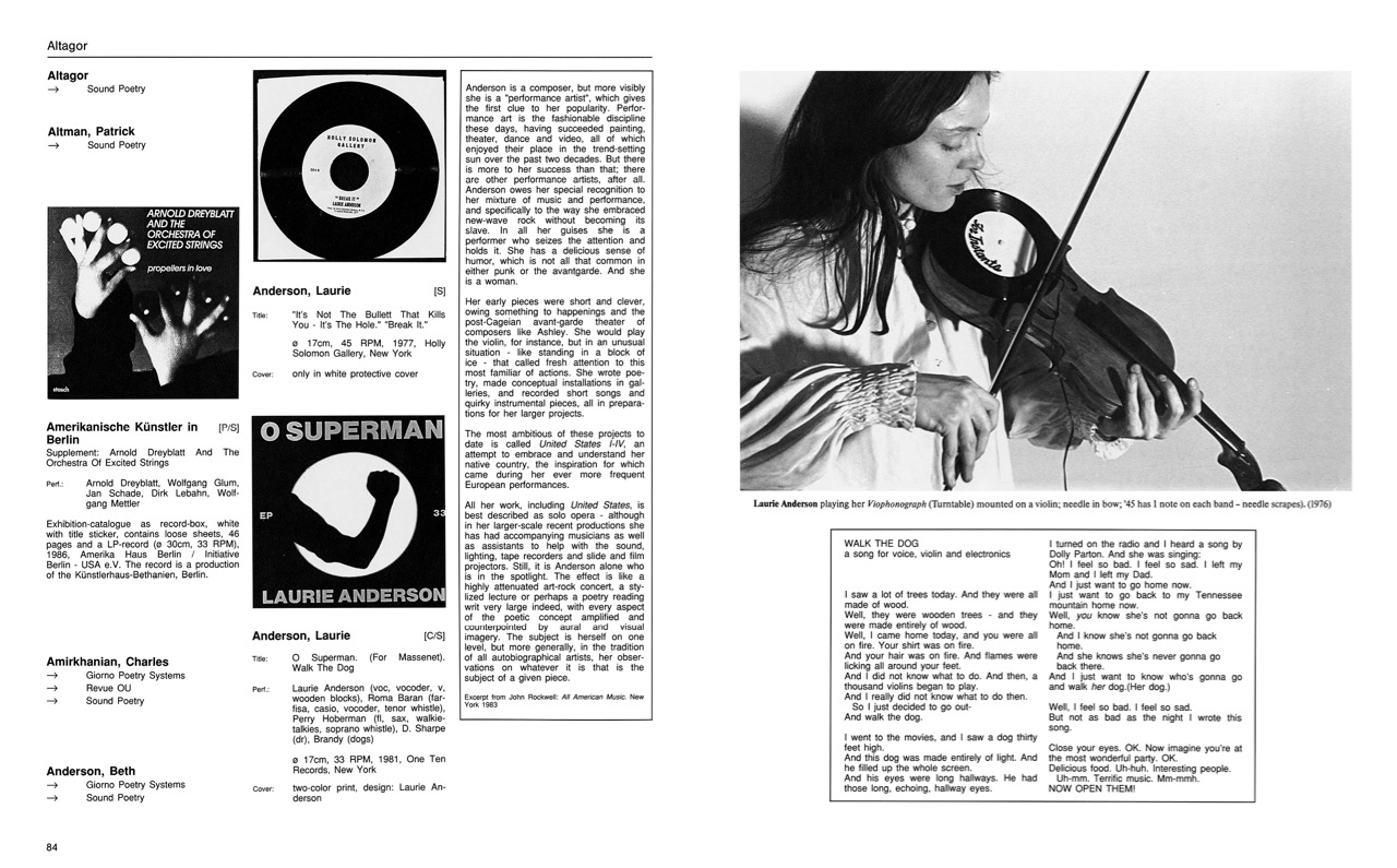 The estimable Brooklyn publisher Primary Information recently issued a meticulous recreation of the rare book. All of the original details have been faithfully replicated, right down to the attached vinyl flexidisc of one of Czech artist-musician Milan Knížák’s startling sound collages, performed by the Arditti String Quartet. The first half of the book includes reprinted essays by luminaries such as Theodor Adorno, László Moholy-Nagy, and Jean Dubuffet, and the text is simultaneously presented in German, French, and English translations. The second half is a lengthy annotated index of hundreds of records and works by artists and musicians. Some, but not all, of these entries are adorned with helpful explanatory text and numerous lush images (including John Cage’s geometric graphic score for Imaginary Landscape No. 5; Joseph Beuys’s eerie sculptures of gramophones festooned with bones and blood sausage; and an expansive floor installation by Christian Marclay, One Thousand Records, at gelbe Musik in 1988.)