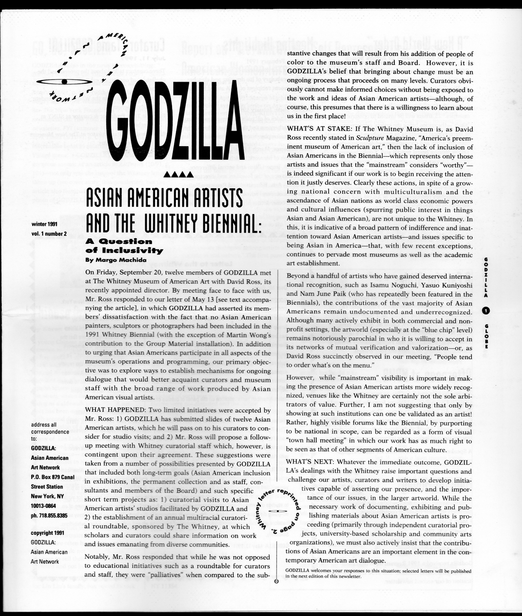 The group wasted no time, hitting an impressive stride early in its existence. In 1991, Godzilla wrote a forceful letter to David Ross, then the director of the Whitney Museum, denouncing the lack of Asian American artists at the 1991 Whitney Biennial. Ross agreed to meet with the group. After the conversation, Godzilla issued a follow-up letter. “As discussed, the regrettable absence of Asian American visual artists in the last Whitney Biennial remains symptomatic of a larger issue—the lack of awareness, or often even interest, among curators in many major institutions, of the numerous artists emerging from Asian American communities and their significant and growing contributions to the public discourse,” they wrote. “To remedy this problem, mechanisms must be established by which staff at the Whitney can become familiar, on an ongoing basis, with the rich range of work produced by Asian American artists.” Godzilla didn’t stop there. They arranged materials on a dozen Asian American artists and sent them to the Whitney’s curatorial staff, pointing out that all the artists were available for studio visits. Godzilla began attracting press. A 1991 piece in Art in America—titled “Guerilla Girls Move Over?”—talked about Godzilla and the group’s newsletter.