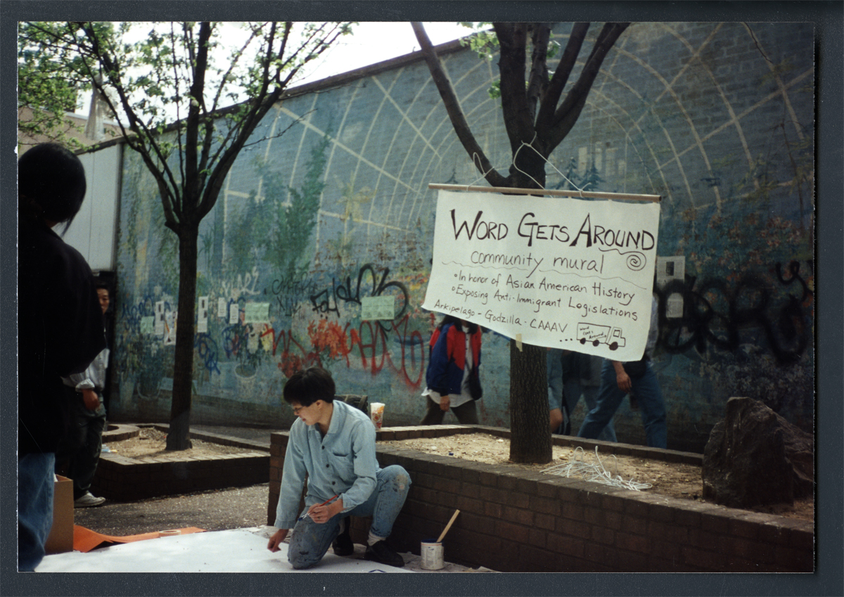 View of Word Gets Around, 1995, a community mural made in collaboration between Godzilla Asian American Arts Network Archive, Arkipelago, and CAAAV. Photo: Fales Library and Special Collections, NYU.