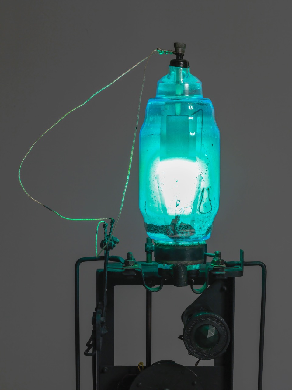 Takis, Télélumière No. 4 (detail), 1963–64. Iron machine parts, light bulbs, wood, brass, steel, electromagnet, string, and paint, approx. 42.5 × 11.8 × 12.6 inches, 11.8 x 23.6 inches. © ADAGP and DACS, 2019. Photo: © Tate (Andrew Dunkley and Mark Heathcote).