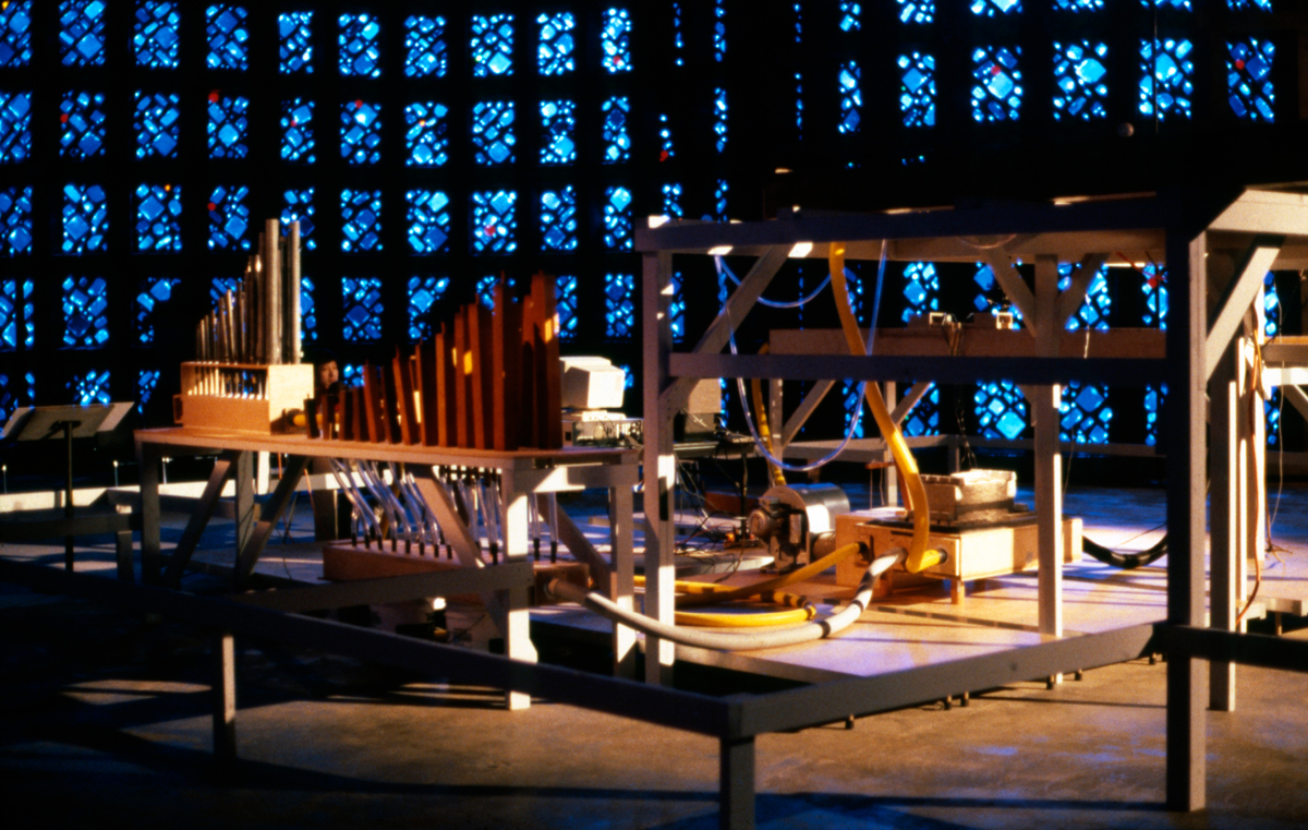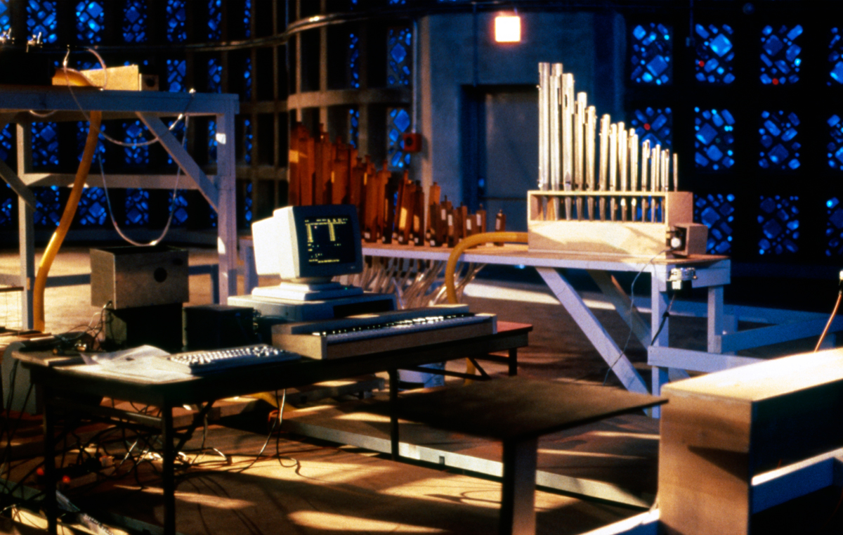 The Appointed Cloud was Wada’s favorite of all his works. It was a fantastical spectacle and immensely popular with people of all ages. The piece was interactive—the components were all computer controlled (no small feat in the 1980s) with a custom interface and software written by engineer David Rayna, also known for his work with Young. Visitors could play the installation by pressing on buttons, leading to a satisfying clang. “A lot of young children came, and they went crazy pushing the buttons and enjoyed it quite a lot,” Wada recalled in Bomb. In a way, it was his big crossover into the mainstream: from downtown art spaces like Maciunas’s Fluxhouses to a popular science museum in Queens, where kids and adults alike could appreciate Wada’s radical sound art while also learning the structure of the atom and the basics of chemistry and biology.